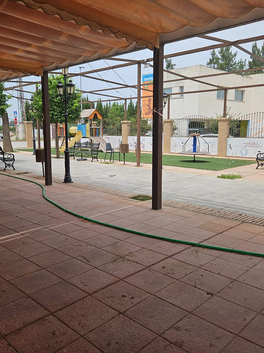 Terraza semicubierta con parque infantil, pensada para comidas al aire libre y reuniones familiares.